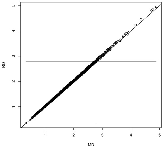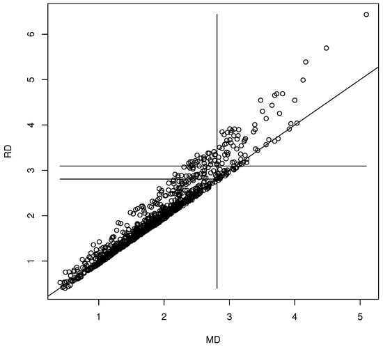 We generated for . The coordinate-wise median was the statistic . The nonparametric bootstrap was used with for the 90% confidence region (10). Then, the th sample quantile of the is the 90.4% quantile. The DD plot of the bootstrap sample is shown in Figure 1. This bootstrap sample was a rather poor sample: the plotted points cluster about the identity line, but for most bootstrap samples, the clustering is tighter (as in Figure 2). The vertical line MD = 2.9098 is the cutoff for the prediction region method 90% confidence region (10). Hence, the points to the left of the vertical line correspond to , which are inside confidence region (10), while the points to the right of the vertical line correspond to , which are outside of confidence region (10). The long horizontal line RD = 3.0995 is the cutoff using the robust estimator. When , under mild regularity conditions, The short horizontal line is RD = 2.8074, and MD = 2.8074 = is approximately the cutoff that would be used by the standard bootstrap confidence region (mentally drop a vertical line from where the short horizontal line ends at the identity line). Variability in DD plots increases as MD increases.