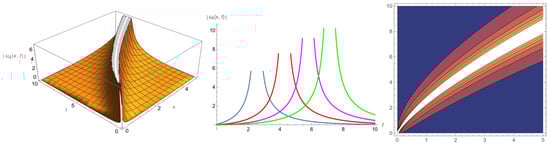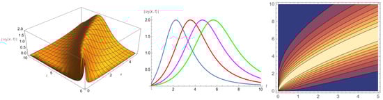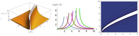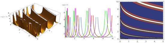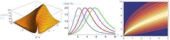 In this section, by selecting appropriate parameter values, we render amplitude images of the soliton, exponential and periodic solutions in the form of 3D, 2D and contour plots. Figure 1 represents the bright soliton with parameters . Figure 2 represents the hyperbolic function solution with parameters . Figure 3 represents the exponential solution with parameters . Figure 4 represents the soliton solution with parameters . Figure 5 and Figure 6 represent the periodic solutions and with parameters .