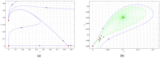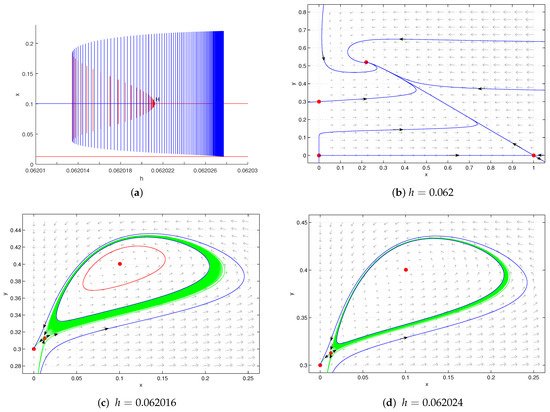 When , the unique positive equilibrium of system (2) without harvesting is globally asymptotically stable. When , this dynamic behavior does not change (Figure 6b). When , there exist two limit cycles, where the inner is unstable and the outer is stable (Figure 6c). When , the unstable limit cycle disappears and the amplitude of the stable limit cycle continues to increase (Figure 6d). As h continues to increase, the unstable positive equilibrium (Figure 6e) will disappear, and all the solutions of system (2) converge to the boundary equilibrium (Figure 6f). Hence, if h is relatively small, the system will be stable in fixed sizes ( or ) or in a periodic orbit, which is determined by the initial values, but if h is large enough, the prey will die out while the predator can survive. That means that the over-harvesting is detrimental to the survival of the prey and will eventually lead to the extinction of the prey. Thus, the nonlinear harvesting enriches the dynamic behaviors of system (2), where we classify the different possible types of equilibrium states in Table 2 based on the local stability and bifurcation phenomena of all the equilibria shown in Figure 3 and Figure 5.
