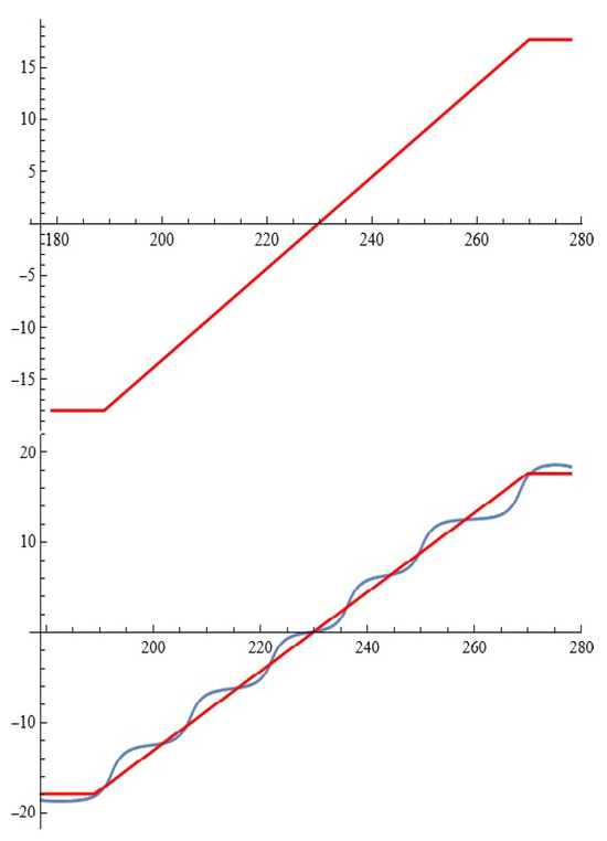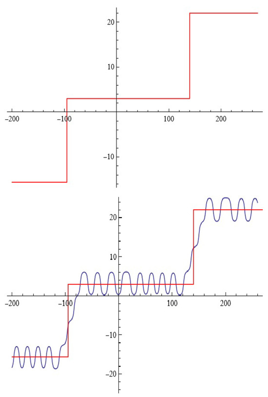 Figure 9 actually depicts the approximation of the cut function (red) by using component of the system (3) for fixed with initial conditions in interval .