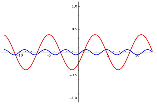 The Melnikov function (7) for fixed and , in the cases when: , (red); , (blue).