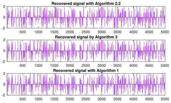 Reconstructed signals obtained using three different algorithms for are displayed from top to bottom. Algorithm 2.2 from [] and Algorithm 3 from [].