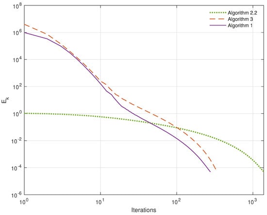 Plots of over iterations when . Algorithm 2.2 from [] and Algorithm 3 from [].