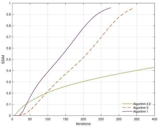 Plots of SSIM over iterations when . Algorithm 2.2 from [] and Algorithm 3 from [].
