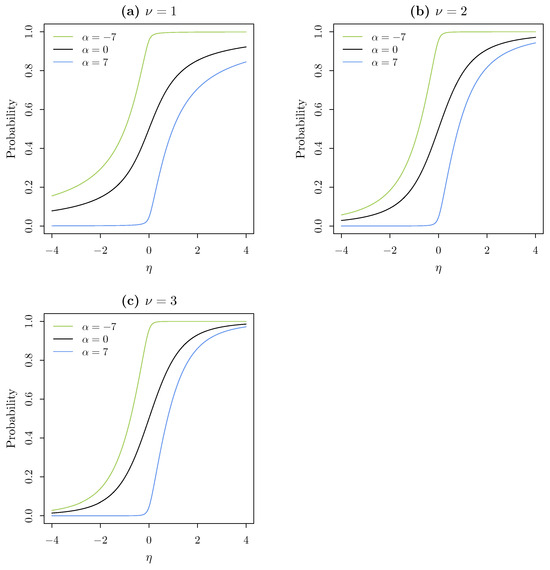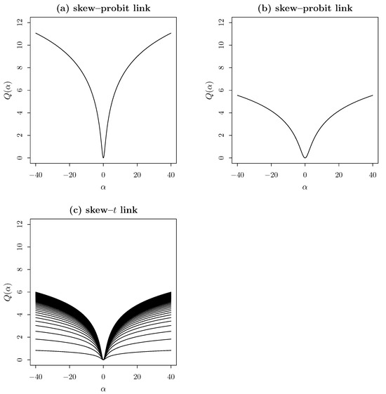 where is the cumulative distribution function of the skew–t distribution introduced by [9,10] with skewness parameter and degrees of freedom . In the context of the Generalized Linear Models theory, is the inverse link function [11],