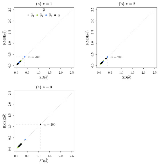 The results of the estimations for scenarios 1 and 2 are detailed in Table 1 and Table 2, respectively. Overall, the absolute bias (12) values are close to zero. Additionally, both the SD (13) and RMSE (14) tend to decrease as the simulation size m increases, indicating greater precision in parameter estimation. These results are illustrated in Figure 4 and Figure 5, corresponding to scenarios 1 and 2, respectively. In both figures, a diagonal line highlights the proximity between the SD and RMSE values, confirming that absolute biases are practically negligible.