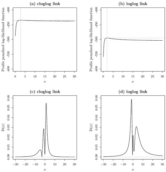 The estimation of the model parameters with skew–t link is carried out using the maximum penalized likelihood method. The penalized score function, obtained as the partial derivative of the penalized log-likelihood function with respect to the parameters, provides the estimation equations that must be solved to find the penalized maximum likelihood estimators. The strategy of fitting a model based on the penalized likelihood function has been widely used in various fields. Moreover, the asymptotic properties of these estimators have been extensively studied and documented in the literature for different models; see, for example, [16,17,18]. A key reference on this method is the book by [19].