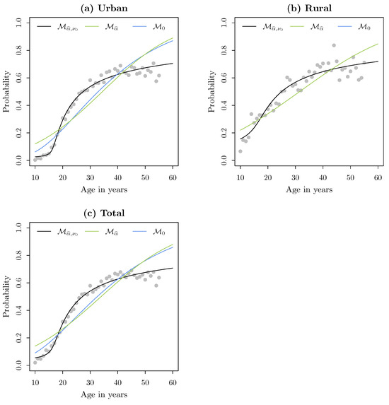 Figure 7 shows the proportion of women who participated in work activities according to their area of residence, with the lines representing the fitted model. This figure demonstrates that, when comparing models and with , the first two do not fit the data in any of the three scenarios. This underscores the need for a model with a flexible link function, which successfully addresses.