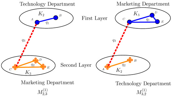 The technical department of a company has two engineers, A and B (complete graph ), and the marketing department has three marketers, C, D, and E (complete graph ). If the probability of successful information transfer between the two engineers is (i.e., the probability of edge failure is ), and the probability of successful message transfer between the three marketers is , and for the purpose of coordinating the project, Engineer A and Marketer Person C need to communicate and the probability of successful message transfer is , then the probability of successful message transfer between all members of these two departments is the reliability polynomial of the two-layer network with edge failure probabilities in the first layer (technology department), in the second layer (marketing department), and for inter-layer edge failures.