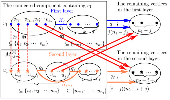 Obviously, . Since there are vertices with degree in the first layer in addition to , there exist ways to select ℓ vertices and . At the same time, there are vertices with degree in the first layer and kinds of selections for the vertices. Obviously, , i.e., . Thus, , . We can see that these two classes of vertices are chosen independently of each other, so the number of such connected components is .