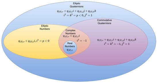 where . Based on the value of p, generalized Segre quaternions are classified into three categories: hyperbolic quaternions (), parabolic quaternions (), and elliptic quaternions () [9]. Each of these systems has specific scientific and technological applications. For example, hyperbolic quaternions are used to solve problems in non-Euclidean geometry [10,11], while parabolic quaternions are applied in robotic control and spatial mechanics [10,12]. Due to the elliptic behavior of many physical systems, elliptic quaternions have significant practical applications in applied science. Additionally, elliptic quaternions offer a notable improvement over real quaternions, especially with their commutative multiplication and enhanced generalization capability [9,10,13,14]. These properties result in reduced computational complexity and improved performance across a range of computational tasks. Specifically, the process of singular-value decomposition within the context of elliptic quaternion matrices is characterized by an algorithmic complexity of , as detailed in [15]. Furthermore, the applicability of the convolution theorem within this mathematical framework enables the formulation of a fast Fourier transform algorithm specifically designed for elliptic quaternion spaces. Consequently, recent developments in elliptic quaternion-valued methodologies have demonstrated their superiority over conventional real quaternion approaches in critical fields such as image processing, signal processing, and deep learning, as evidenced by [7,14,15,16,17].