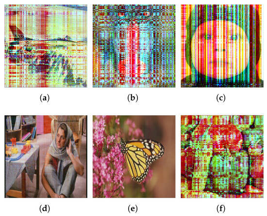 All experimental test images: (a) airplane.png (), (b) baboon.png (), (c) baby.png (), (d) Barbara.png (), (e) monarch.png (), and (f) peppers.png ().