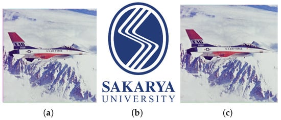 The watermark image sau.png in Figure 18b is embedded in the host image airplane.png via the function elliptic_q_embedding_watermarking() as represented in Listing 10