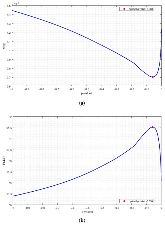 Figure 19 shows the MSE and PSNR values between the host image and a watermarked image corresponding to p-values given in the range of with a step size of (). According to the graphs, the least MSE is , and the maximum PSNR is for the optimal .