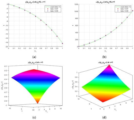 The comparison between the exact and numerical solutions for Equation (18) is shown in Figure 1a,b. We obtain the exact solution at and we use different values of , such as (, ), for the approximate solution. The surfaces in Figure 1c,d show the exact solutions of the functions and at , respectively.