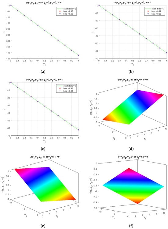 The comparison between the exact and numerical solutions for Equation (49) is shown in Figure 2a–c. We obtain the exact solution at , and different values of , such as (, ), are used for the approximate solution. The surfaces in Figure 2d–f show the exact solutions of the functions , and at and , respectively.