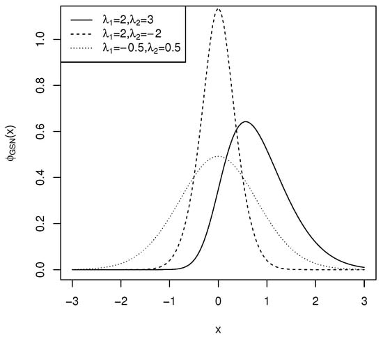 The three-parameter skew-symmetric generalized normal distribution, denoted as , is derived by substituting the symmetric density function from (2) into (4). In this formulation, we utilize the standard normal distribution function, represented as , and define the weighting function . This approach allows us to capture the skewness and symmetry properties inherent in the distribution.