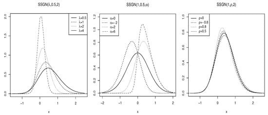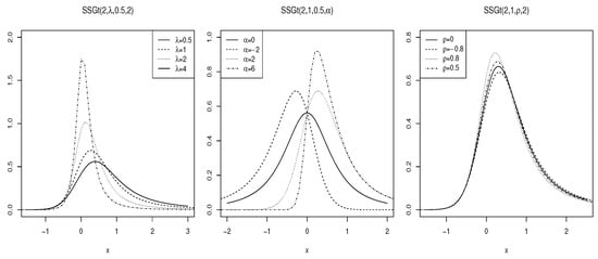 The plots of the density function of for various parameter values are shown in Figure 6.