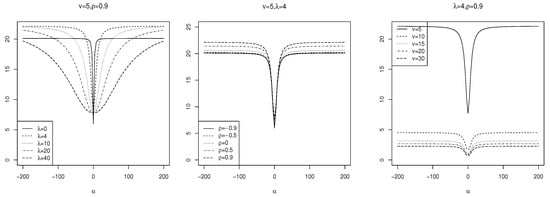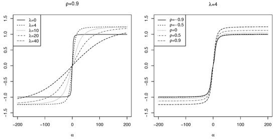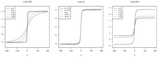 Thus, the first four moments of can be obtained using the first four moments of in Equations (9)–(12). Consequently, the skewness and kurtosis of can be derived from Equations (13) and (14), respectively. The plots of skewness and kurtosis of for various parameter values are shown in Figure 7 and Figure 8, respectively.