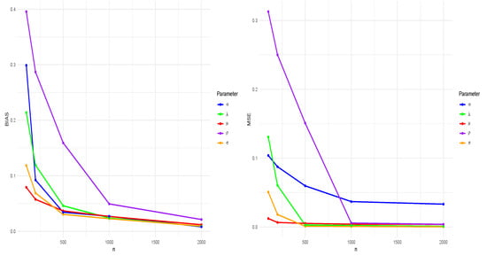 As the evaluation metrics measured for the estimators, the mean squared error (MSE) and bias are computed, and the results are summarized in Table 1. Moreover, Figure 9 shows the MSE of the parameters and the absolute value of bias for different values of n.