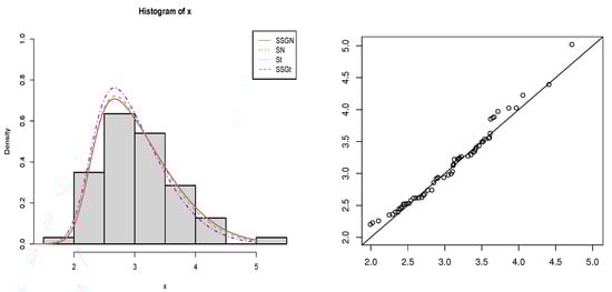 The MLEs of parameters, the corresponding standard error, log-likelihood, Akaike information criterion (AIC), Bayesian Information Criterion (BIC) and the p-value of the Kolmogorov–Smirnov (KS) test are reported in Table 3. According to the p-value of the KS test, the goodness-of-fits of all distributions are confirmed. However, as seen in Table 3, has the minimum AIC and BIC and thus provides the best fit for the data. The corresponding Q-Q plot of the model, along with the histogram of the data including the fitted curves, is shown in Figure 10.