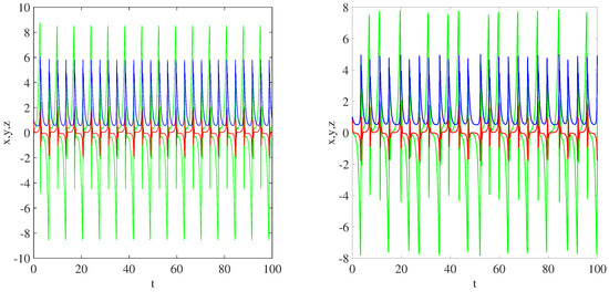 Time series plots of the systems (1) under different parameters. Left: , , , , . Right: , , , , .