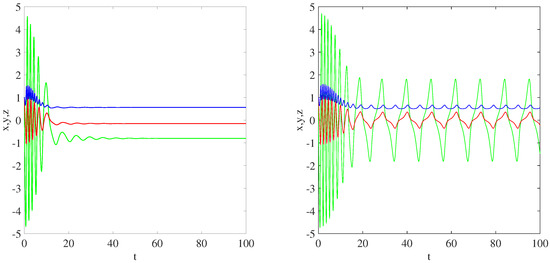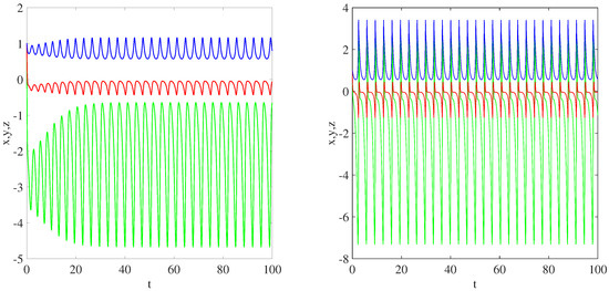 Time series plots of the systems (1) under parameters , , , . Left: , right: .