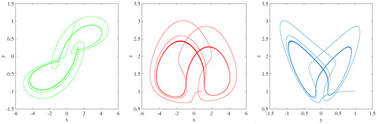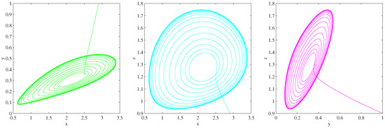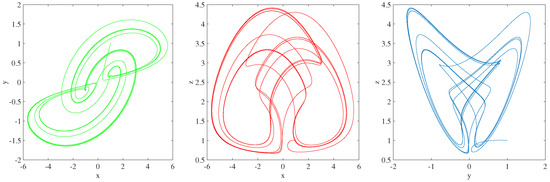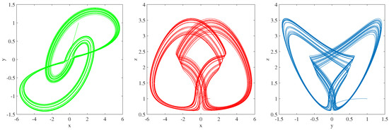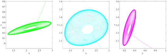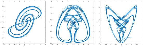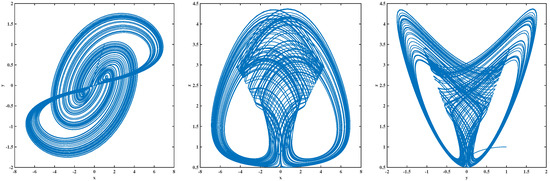 In this section, we will look at several examples of simulations. It is demonstrated that there exist some novel chaotic behaviors. We take into consideration system (1) with: , , and . Additionally, we have the following parameters: , , , and .
