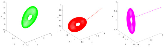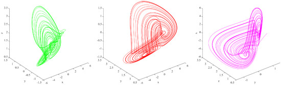The complex dynamic behaviors of the systems (1) are illustrated in Figure 1, Figure 2, Figure 3, Figure 4, Figure 5, Figure 6, Figure 7, Figure 8, Figure 9 and Figure 10. In Figure 1, Figure 2 and Figure 3, x is shown in green, y in red, and z in blue. Figure 1 presents time series plots of the systems (1) under the left figure with and the right figure with . Figure 2 presents time series plots of the systems (1) under the left figure with , , and the right figure with , . Figure 3 presents time series plots of the systems (1) under the left figure with , , and the right figure with , . Figure 4 shows numerical simulations for the systems (1) under varying parameters and different values of , . Figure 5 shows numerical simulations for the systems (1) under varying parameters and different values of , . Figure 6 presents numerical simulations for the systems (1) under varying parameters and different values of , . Figure 7 illustrates numerical simulations for the systems (1) under varying parameters and different values of , . Figure 8 shows numerical simulations for the systems (1) under varying parameters and different values of , . Figure 9 presents numerical simulations for the systems (1) under varying parameters and different values of , . Lastly, Figure 10 shows numerical simulations for the systems (1) under varying parameters and different values of , . The results obtained through integer order for the simulation are quite close to those from other methods. In this paper, we present new chaotic fractional attractors.