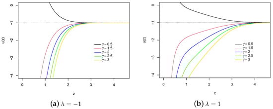 Depending on whether or , where is a solution of Equation (4), the inflection points can be local maxima or minima. Figure 3 shows the shape of for and selected values of and . From here, we observe that the pdf of the PTPN distribution has a local maximum.
