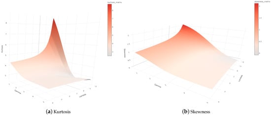 Table 2 presents the values of the mean, standard deviation, kurtosis coefficient and skewness for various combinations of , with fixed. It is observed that, for negative values of and as decreases, the kurtosis is increased. This behavior is illustrated in Figure 4.