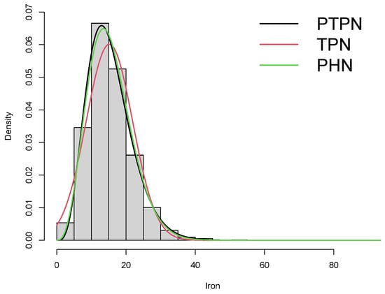 Histogram of the variable Iron and the estimated pdf: PTPN (black line), TPN (red line) and PHN (green line).