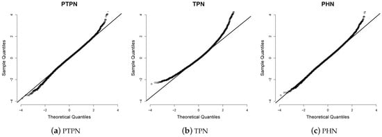 QQ-plots of (a) PTPN, (b) TPN and (c) PHN models, in Iron data.
