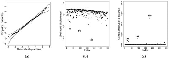Quantile residuals (a), likelihood displacement (b) and generalized Cook’s distance (c) resulting from fitting the RPTPN model at .