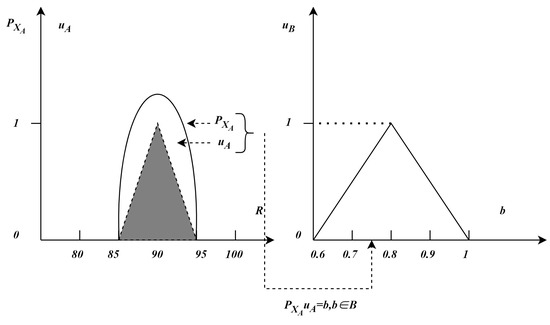 Second, according to the meaning of a Z-number, the second fuzzy number B represents the reliability of the fuzzified element, which is the reliability of A. Given the initial value of the fuzzy number B as , for each sample in the set N, obtain the degree to which each belongs to the membership function using Equation (10).