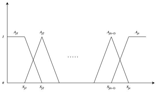 represents the -th fuzzy number defined by the j-th attribute, and it is a trapezoidal fuzzy number, denoted by . The membership functions of the generated fuzzy numbers are shown in Figure 2. The fuzzy numbers on the sides adopt trapezoidal membership functions, while the fuzzy number in the middle adopts a triangular membership function.