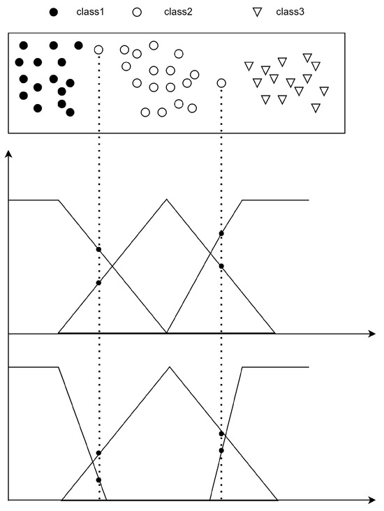 From the definition of a Z-number, it can be seen that the fuzzy number A restricts the value of the variable X, which is calculated using the membership function from classical fuzzy sets. Assume the training dataset X is an matrix, where n is the number of samples and m is the number of conditional attributes. represents the j-th column of X, which is the j-th attribute of X. denotes the i-th sample of X. Suppose dataset X contains c different classes, denoted as .