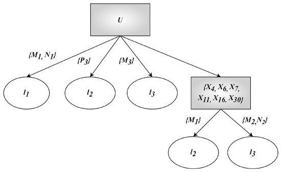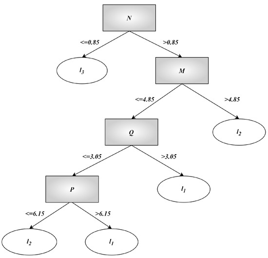 The decision information table S of the original data for the sample in Section 4.4, as shown in Table A1, with sample set , where the condition attributes include {P, Q, M, N} and the decision attribute .