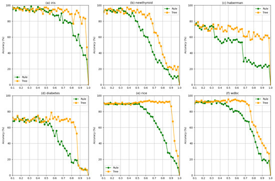 Based on the analysis of parameter , when , the classification accuracies of both algorithms are not significantly different. In this case, using the rules extracted by the FR-ZREA for classification is a more efficient choice due to a lower time complexity. When , the advantages of the FR-ZRDT gradually become apparent, as the generated fuzzy decision tree can provide a higher classification accuracy and is more suitable for classification tasks with higher complexity.