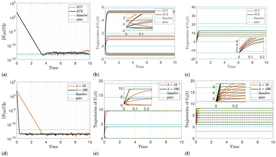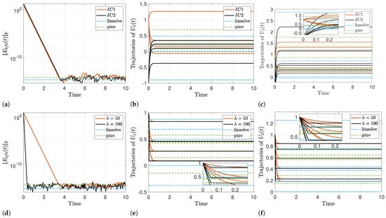 This part presents the results from the four numerical examples that examine the performance of the ZNN models, which are shown in Figure 1 and Figure 2. Particularly, Figure 1a,d and Figure 2a,d show the ZEF errors in Examples 1–4, respectively, while Figure 1b,e and Figure 2b,e show the trajectories of , and Figure 1c,f and Figure 2c,f show the trajectories of .