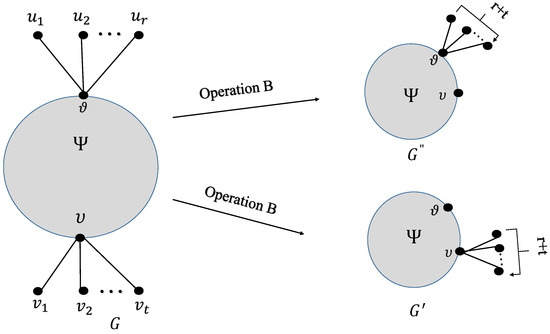 Operation B: Let G be a graph, be two vertices in G, leaves adjacent to be and leaves adjacent to vertex be . We obtain two graphs and such that and , as shown in Figure 2.