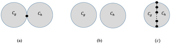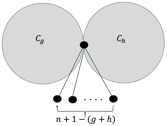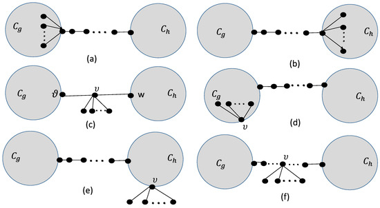 By means of operations A and B on G, we obtain where all the non-cyclic edges are attached to the same vertex v. Then, by means of Lemma 1 and Lemma 2, we have that the equality holds iff all the non-cyclic edges are attached to the same vertex in G. If , then u and v are not the same vertices, that is, and u is the common vertex of and .