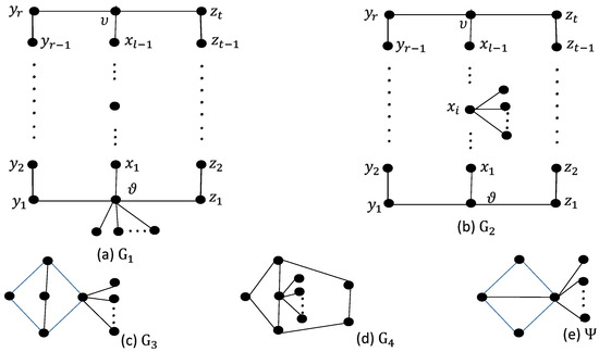 Let be a graph from in which pendant edges are connected to the vertex that is common in and as in Figure 4.