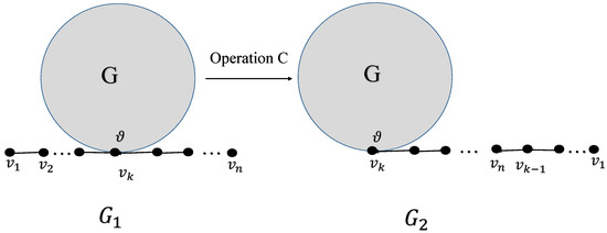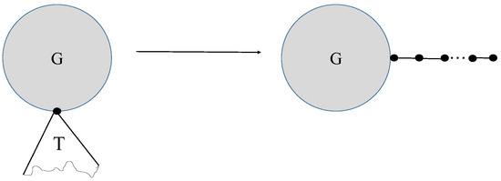 Let be the graph in Figure 23; if there is a path , where , attached to the vertex . Let be obtained from by deleting and adding ; then, .