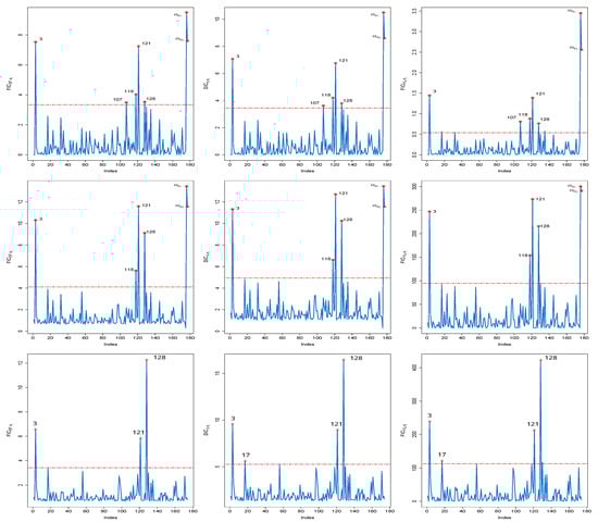 In this real example, the Bayesian local influence diagnostics, which include the Bayes factor (denoted as ), -divergence (represented as ), and posterior mean distance (indicated as ) [], are assessed based on the parameter vector . This evaluation is conducted using 200 observations, which were obtained through the previously developed variational Bayesian algorithm in conjunction with the specified prior distributions. In the enchanting field of Bayesian local influence diagnostics, we present our findings alongside their benchmarks, beautifully captured in Figure 1. A closer inspection of this visual wonder reveals that cases 3, 121, and 128 emerge as the stars of the show, wielding their influence across all quantile levels, whether it is = 0.25, 0.5, or 0.75. Meanwhile, case 118 stands out at quantiles and . Case 107, alternatively, is continuously influential at quantile 0.25, irrespective of the local influence metrics used. Notably, the identification of as influential by three local influence measures raises concerns about the accuracy of the MAR assumption for missing data.