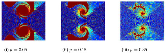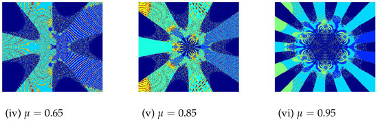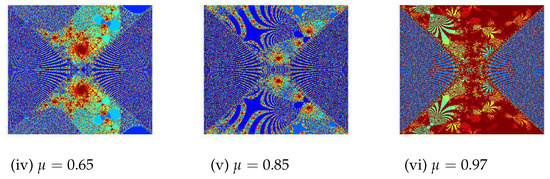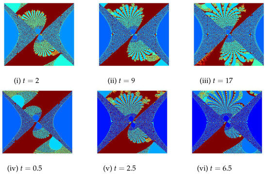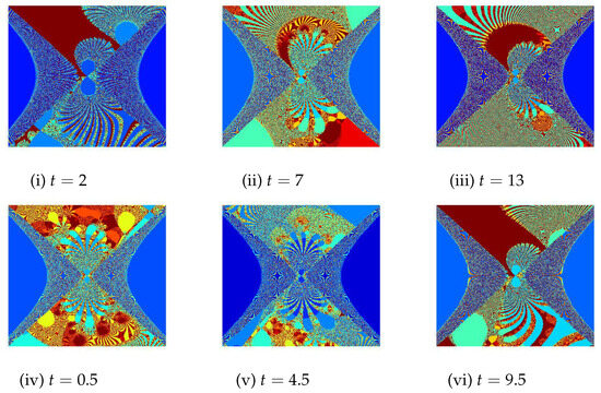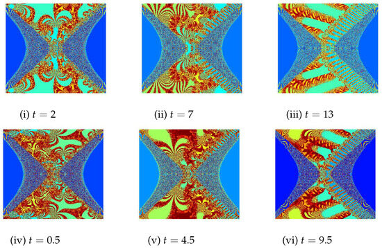 In Figure 2, the values of and c are fixing as purely real, while the value of t is vary. In the first case, integer values of t are used, specifically (Figure 2i–iii). In the second case, non-integer values are considered, specifically (Figure 2iv–vi). The images clearly demonstrate that the value of t significantly affects the shape, size, and color of the fractals, with the sets exhibiting symmetry about the real axis. The resulting Julia sets resemble intricate patterns, such as Rangoli designs or stained-glass artwork.