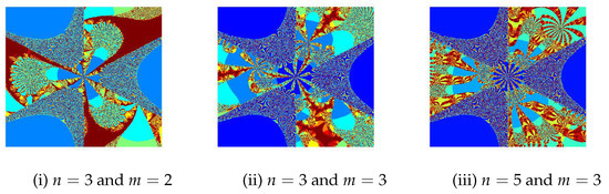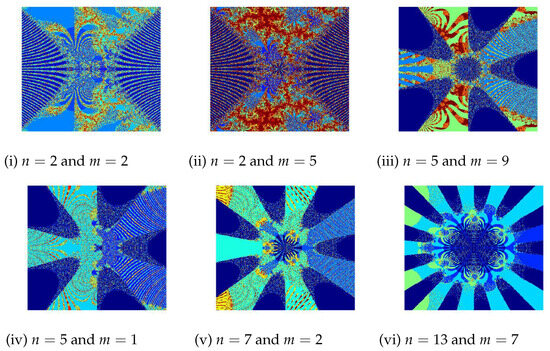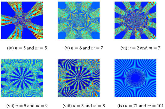 As shown in Figure 10, we fixed the values of all parameters and varied the values of n and m. From these images, we observe that as n and m increase, the sets take on circular shapes, with petal counts corresponding to the values of n and m, and the number of petals increases with increased values of n and m. The obtained images display beautiful and complex fractal shapes, and the resulting Julia sets resemble floral shapes or intricate glass art (Table 9).