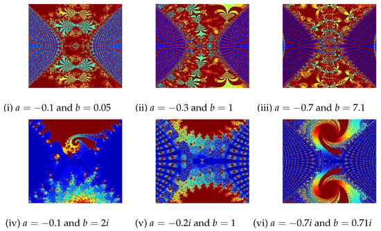 As shown in Figure 7, the values of a and b have a significant impact on the shape, size, and color of the fractals as Julia sets. The generated Julia sets resemble Rangoli designs or may be viewed as glass paintings, with pattern arms differing slightly for different values of a and Additionally, axial symmetry is a notable feature in the resulting sets. In each Julia set image except , specific lashes show symmetry along the x-axis and extend symmetrically along the positive x-axis from each edge of a leaf-like shape, with some of these lashes spiraling outward. The image generation time is also recorded and provided in the last column of the Table 6.