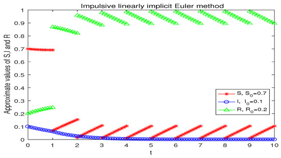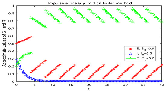 Impulsive linearly implicit Euler method for (1) when , , , , and .