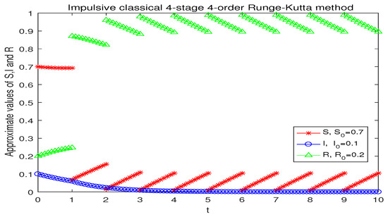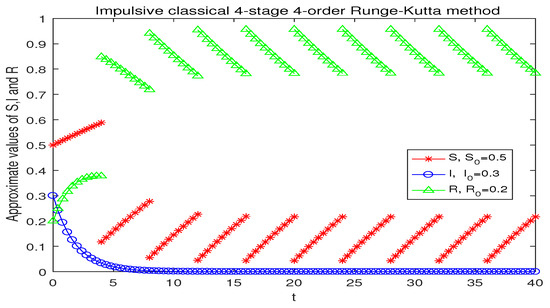 Impulsive classical 4-stage 4-order Runge–Kutta method for (1) when , , , , and .